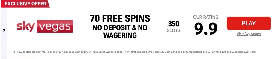The first offer I chose was one from SkyVegas. Mostly because it was claiming 70 free spins with no deposit or wagering – win! I followed through the link, created an account and then claimed my 70 free spins.