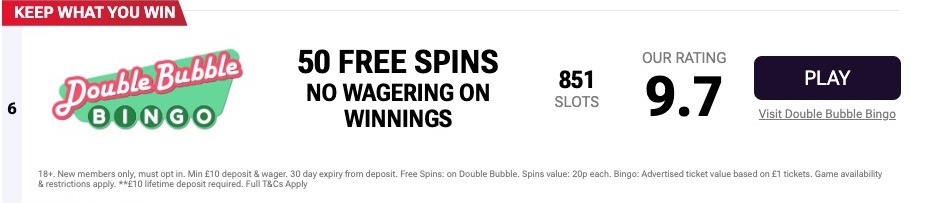 I couldn’t find my 200 free spins so I assumed they needed time to confirmed. In the meantime I went back onto StrikeWild to find offer number two so I’d get my 500SB. This offer from Double Bubble Bingo came up and the “keep what you win” sold it to me.