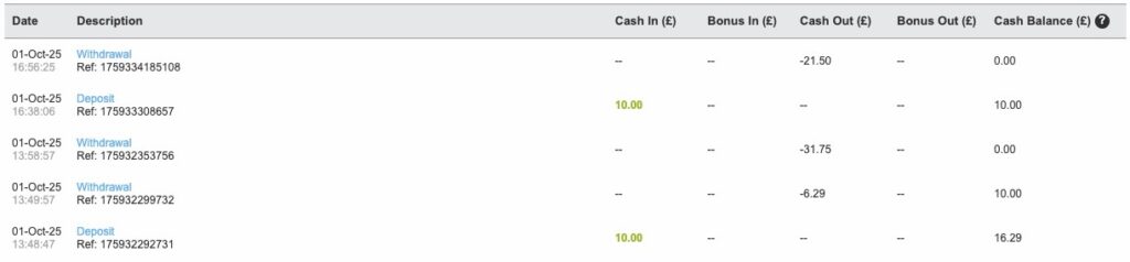 Nope, I was wrong. So technically the £10 I’d deposited and played through didn’t actually count. Annoying. But I still needed to complete the offer for my 500SBs so I activated it correctly, deposited another £10 and played through the funds.