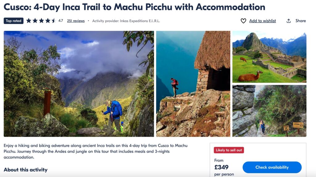 I booked this tour through GetYourGuide and the upfront cost was £347.45 for my dates which were in the middle of August. I booked around 2 months out. Compare to the classic Inca Trail this one is almost half the price so I was shocked that it included accommodation too.