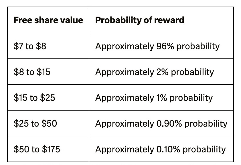 You should expect to get between $7-$8 in your free share value which is £5-£6 when converted. If you’re lucky you may get higher and like any random lottery, someone has to get the bigger values and maybe that someone will be you!